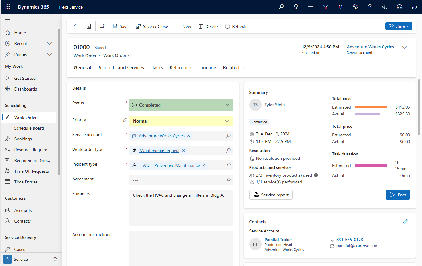 Work orders generate from service cases, sales orders, emails, phone calls, service agreements, web portals, or Internet of Things (IoT) data and then display in Field Service. Work orders are typically grouped by geographical territory and lines of business. Work order details consist of a checklist of tasks, parts to use, labor to bill to the customer, and characteristics required. Copilot in Field Service can generate a customizable summary the detailed work order.