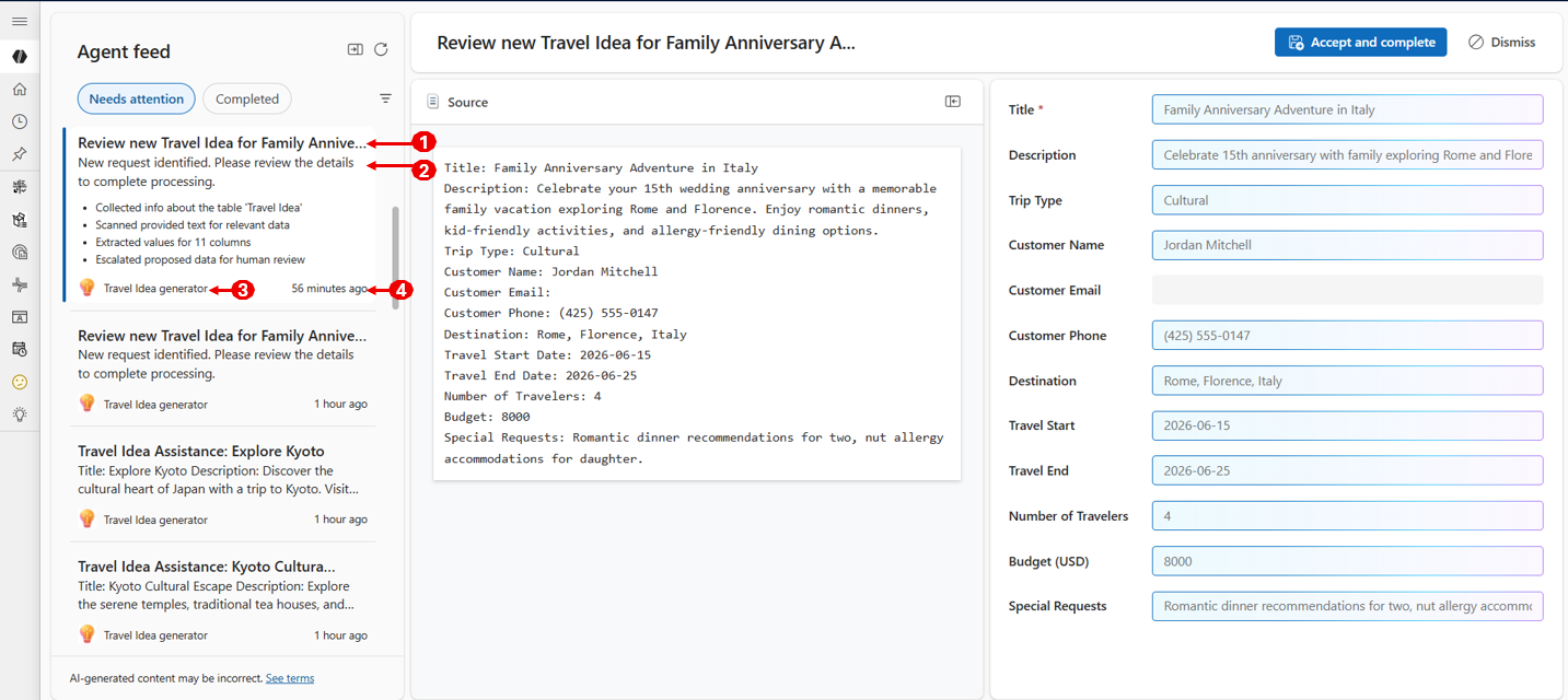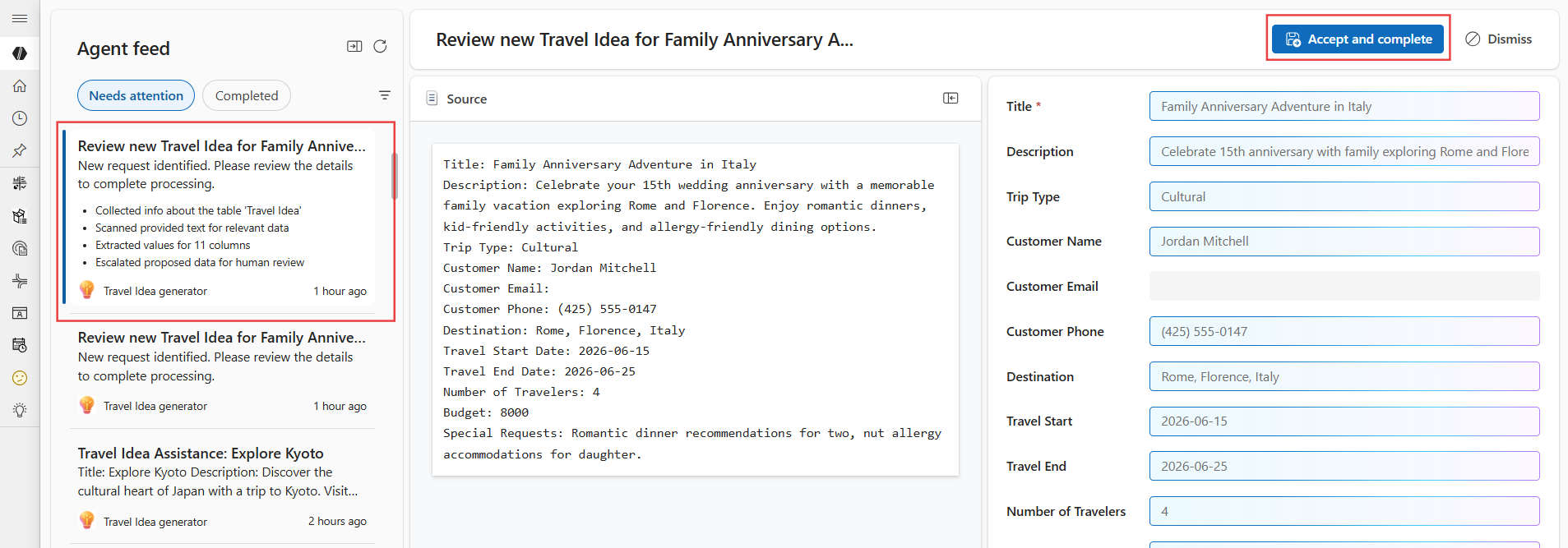 • Accept and complete: Move a data entry task from the Needs attention section to Completed after reviewing and accepting the data entry suggestions from invoke_data_entry mcp tool. The Accept and complete button is available inside the agent pane associated with the agent feed task.