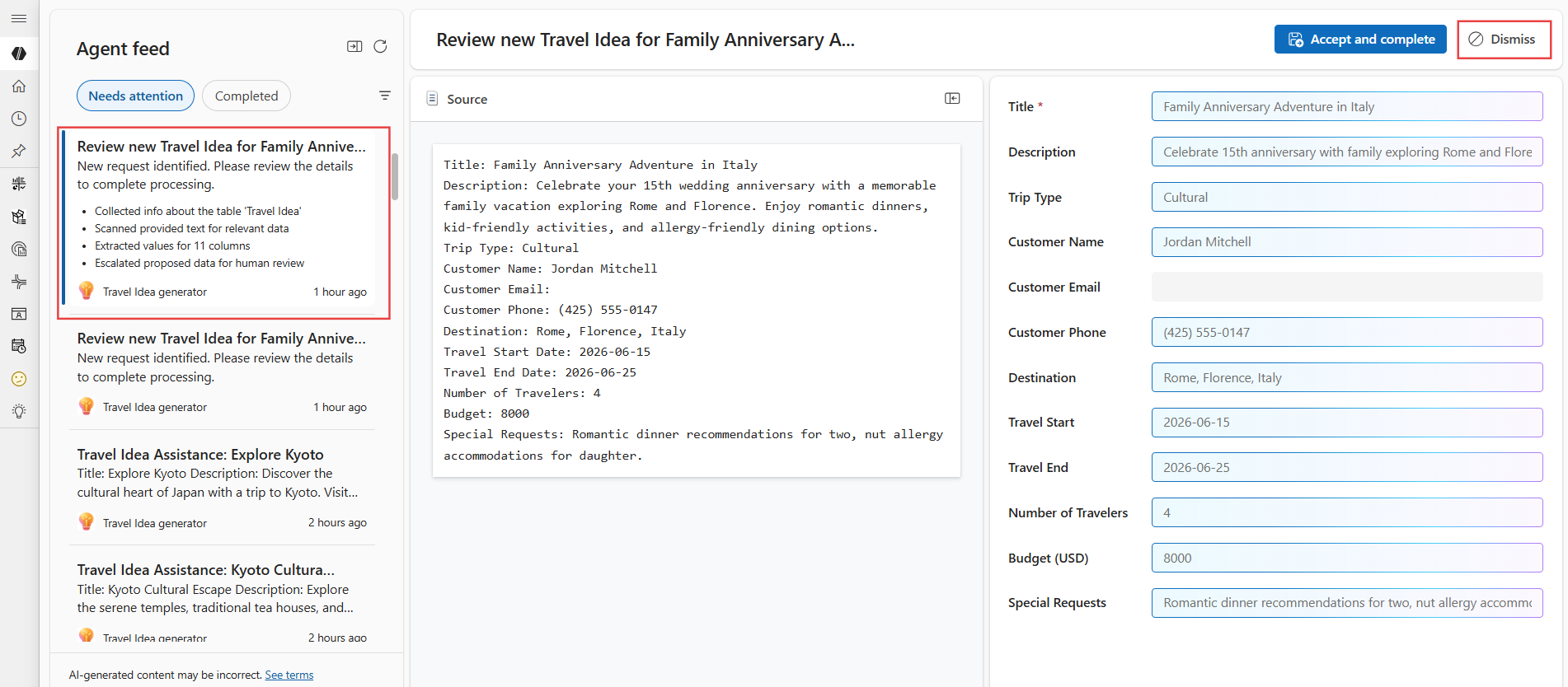 • Dismiss: Remove a data entry task logged via invoke_data_entry mcp tool from the Needs attention section if it's no longer relevant. The Dismiss button is available inside the agent pane associated with the agent feed task.