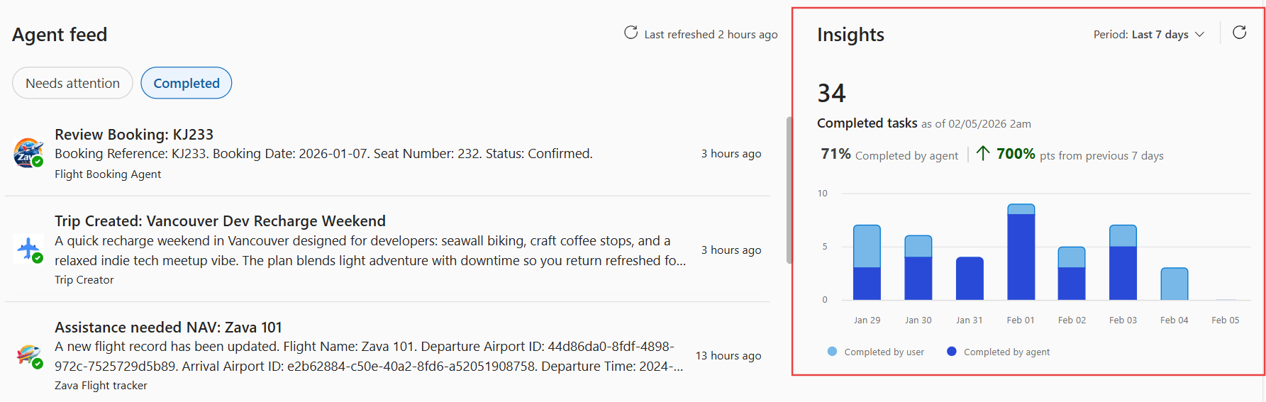 The default insights panel complements the agent feed by giving users a clear, aggregated view of how their agents and users collaborate over time. While the agent feed surfaces individual tasks and actions in the moment, the Insights chart provides a historical, high‑level representation of those interactions. This representation helps organizations understand the true patterns of human–agent collaboration, whether users step in to provide missing context, guide agents through a complex workflow, complete tasks directly, or monitor agent activity. By visualizing these trends over time, organizations gain transparency into how their agentic workflows actually operate in practice, strengthening trust, identifying friction points, and revealing opportunities to improve system reliability and user experience.