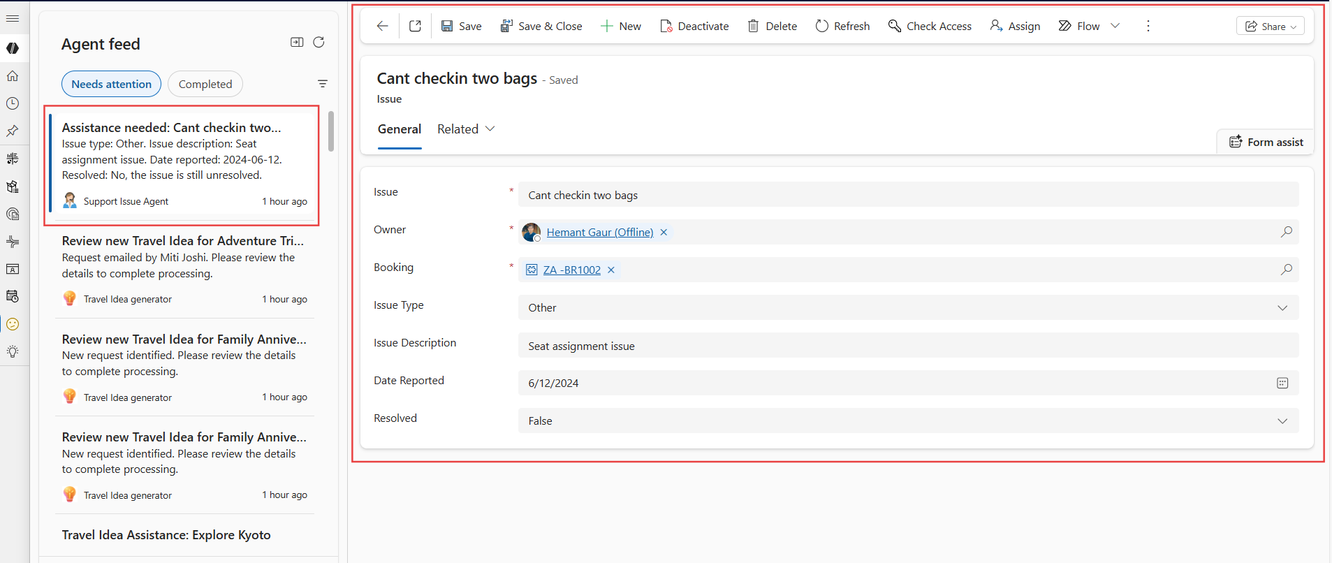 Agent feed tasks generated through the request_assistance or request_review MCP tools can reference a Dataverse record as a related navigation link in the agent description. This reference allows users to easily open and review associated data when interacting with the feed item.