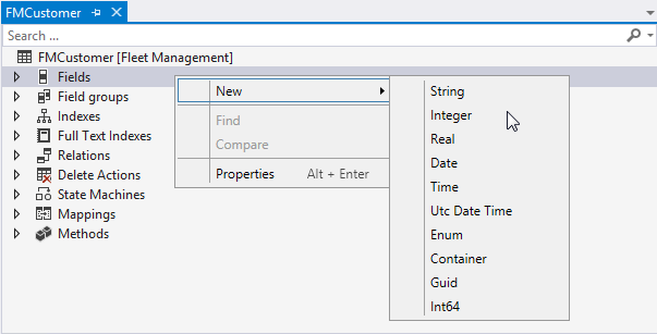 The value of a node in the element designer is often a reference to another element. For example, a field node in a table element is typically based on an extended data type (EDT) element. When you right-click a node in the element designer, you can click the Go to <element> command to navigate to that related element. For example, when you right-click the FuelType node in the list of fields for the FMVehicle table, you can click Go to Base Enum FMFuelType to show the base enumeration that is used to define the field.