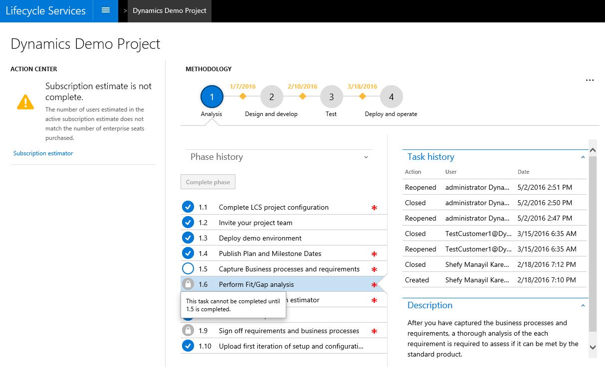When you've completed all the required tasks in a phase, you can click Complete phase to mark the phase as completed. After you mark a phase as completed, next steps become available in Lifecycle Services.
