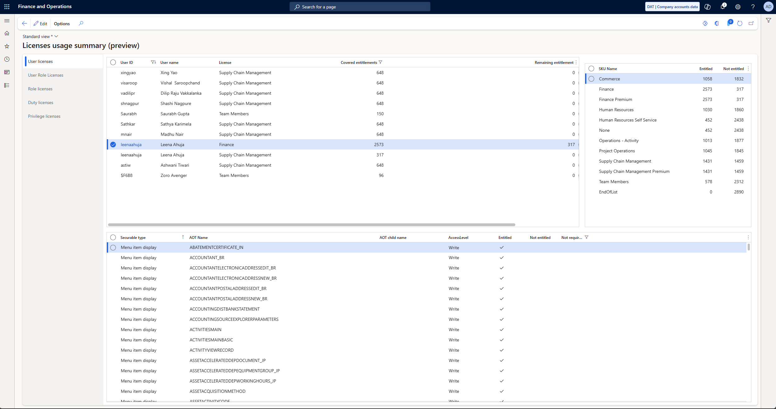 Use the User license summary page in the User security governance workspace to understand how security roles and respective permissions define the license requirements across your Dynamics 365 finance and operations environment.