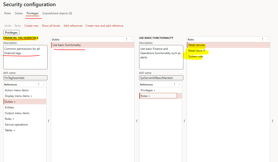 Financial tag controls require the Financial tag essentials privilege, which grants access to the display menu items used by the financial tag preview. By default, this privilege is included in the Use basic functionality duty, which is assigned to the System user, Retail service, and Retail store IT roles.