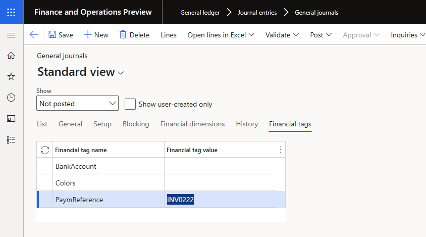 - Tag values that you add to the journal batch header are entered as default values on the account of each line that's added to the voucher.