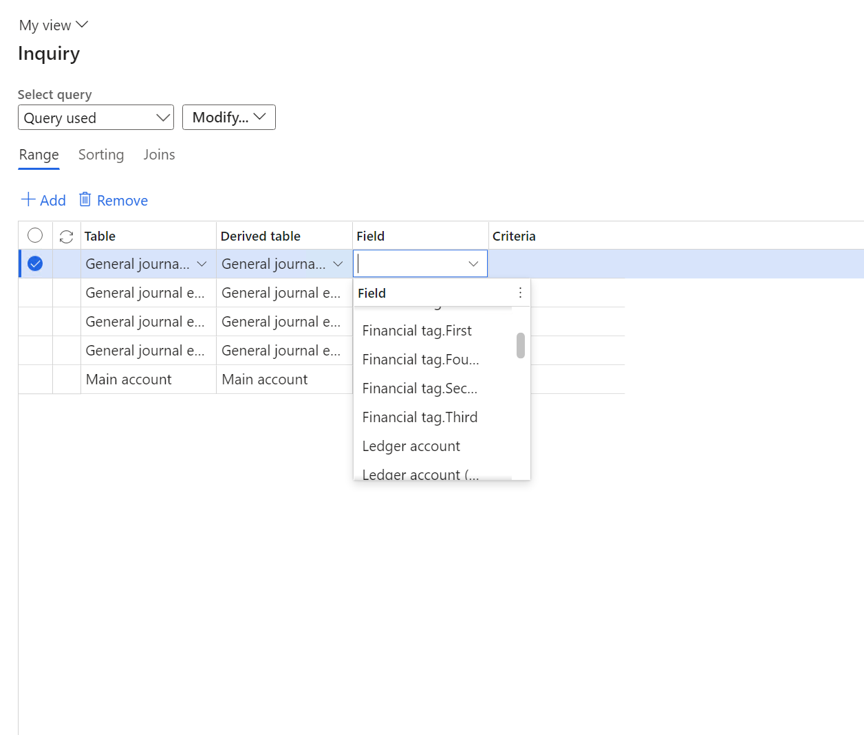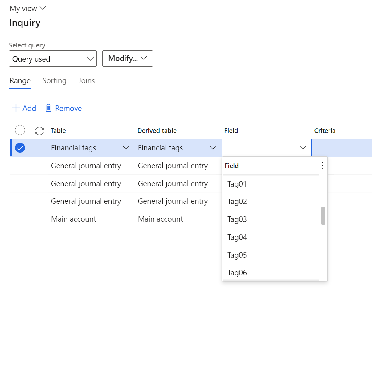 Instead, select General journal account entry as the table. The financial tag fields appear with their configured names, so you can identify and filter on the correct tag.