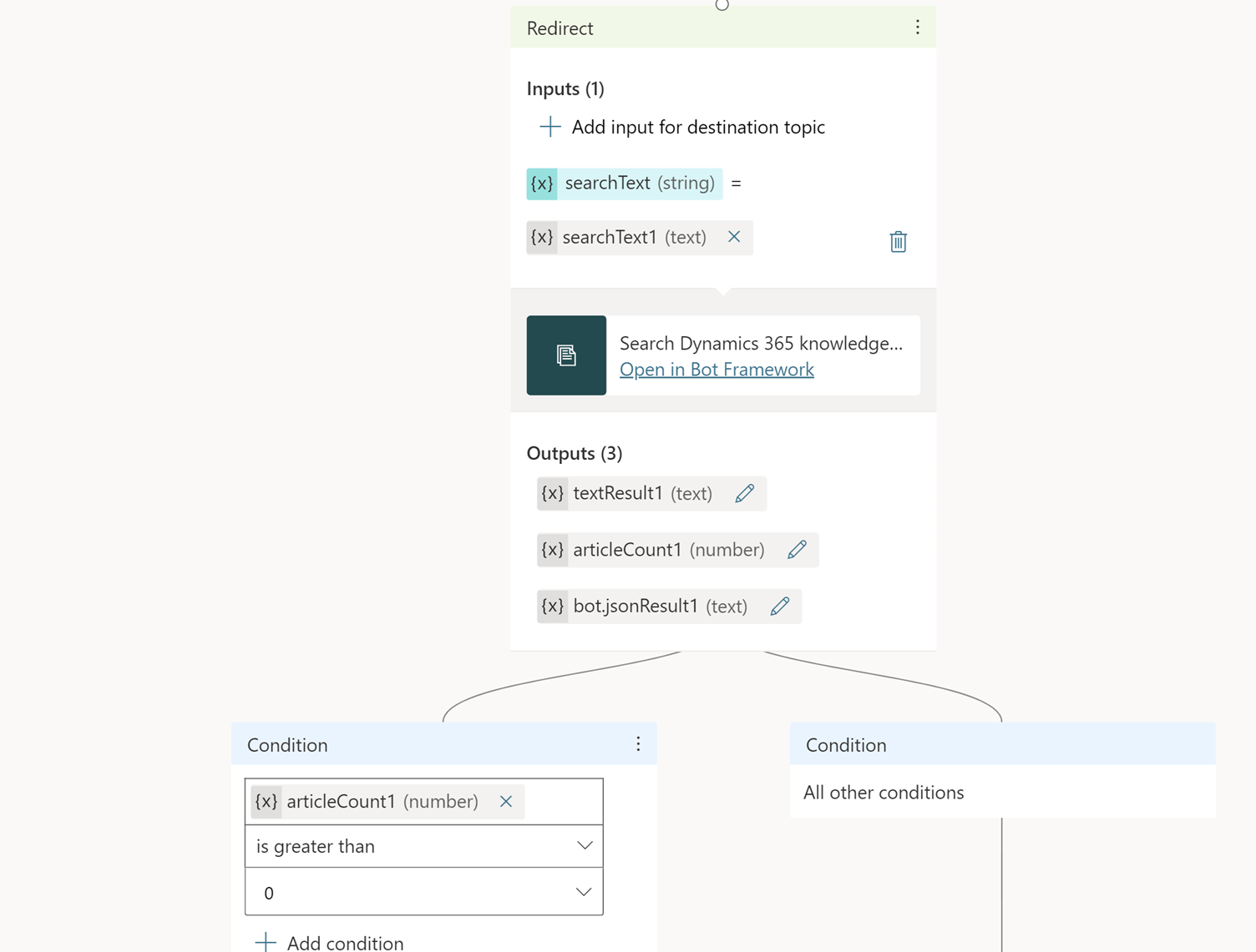 The action's output is the result of the knowledge base search. The value is stored in the variable bot.jsonResult1 (text), and the count of the articles that were returned in the search result is stored in the variable articleCount1 (number), which is redirected to condition to check if the search returned any article or not, such as in articleCount1 (number) is greater than 0.