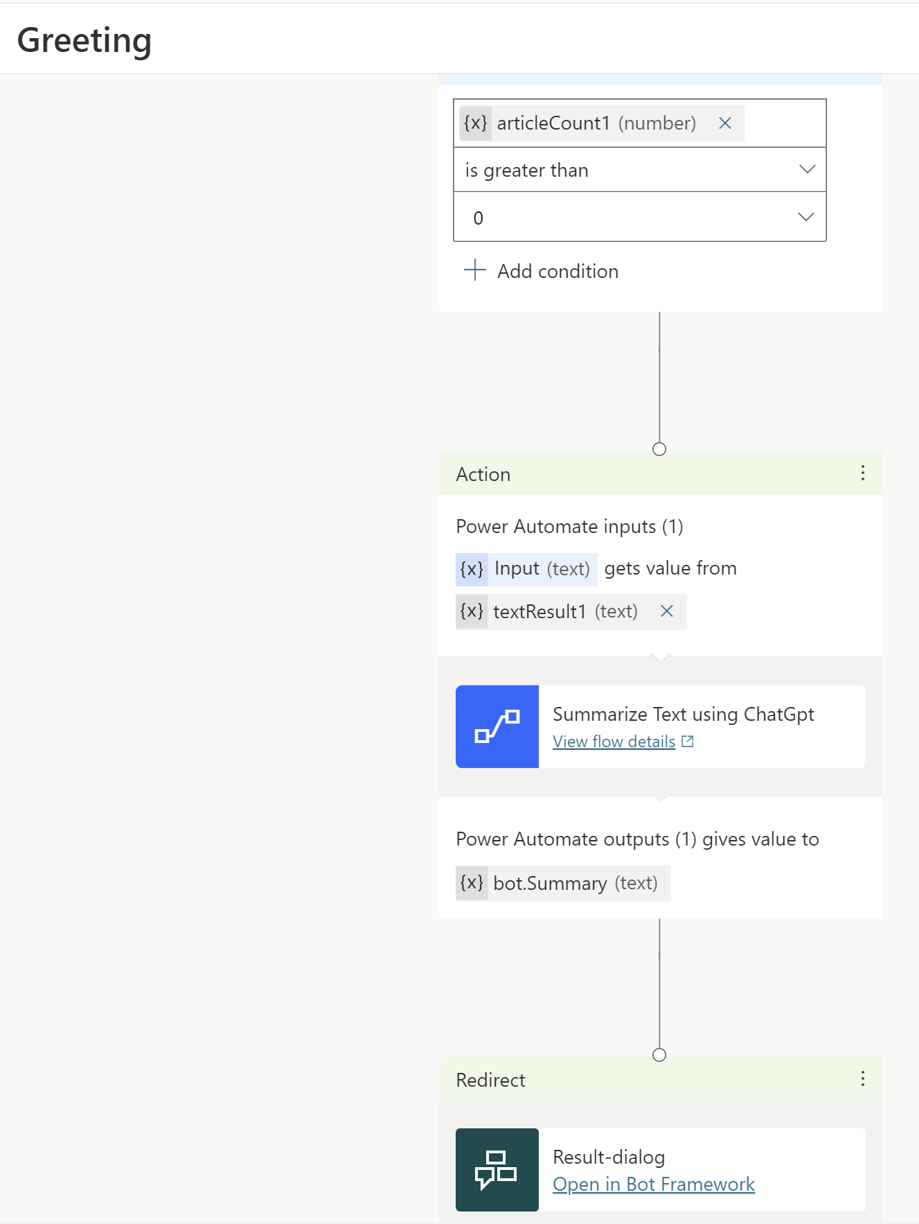 Next, we'll incorporate an action that triggers Power Automate to invoke ChatGPT's API for article summarization based on the output of the condition. The output of the flow is then redirected to the Result-dialog to display the result in an adaptive card.