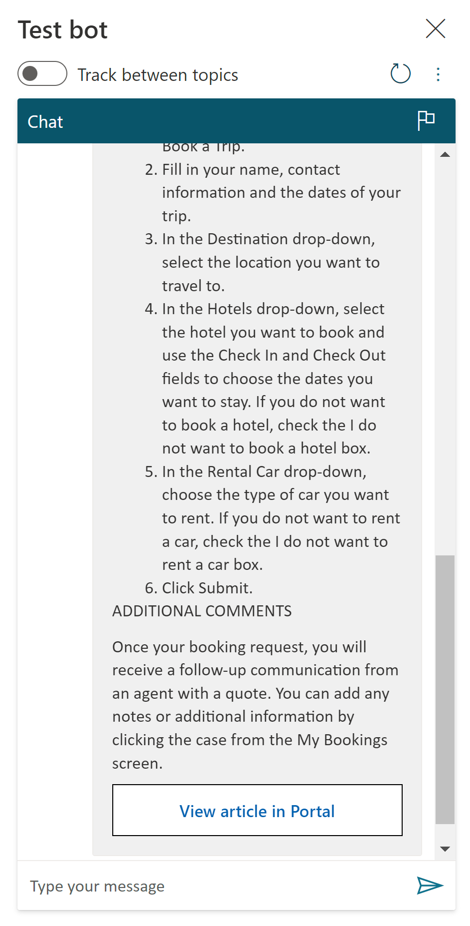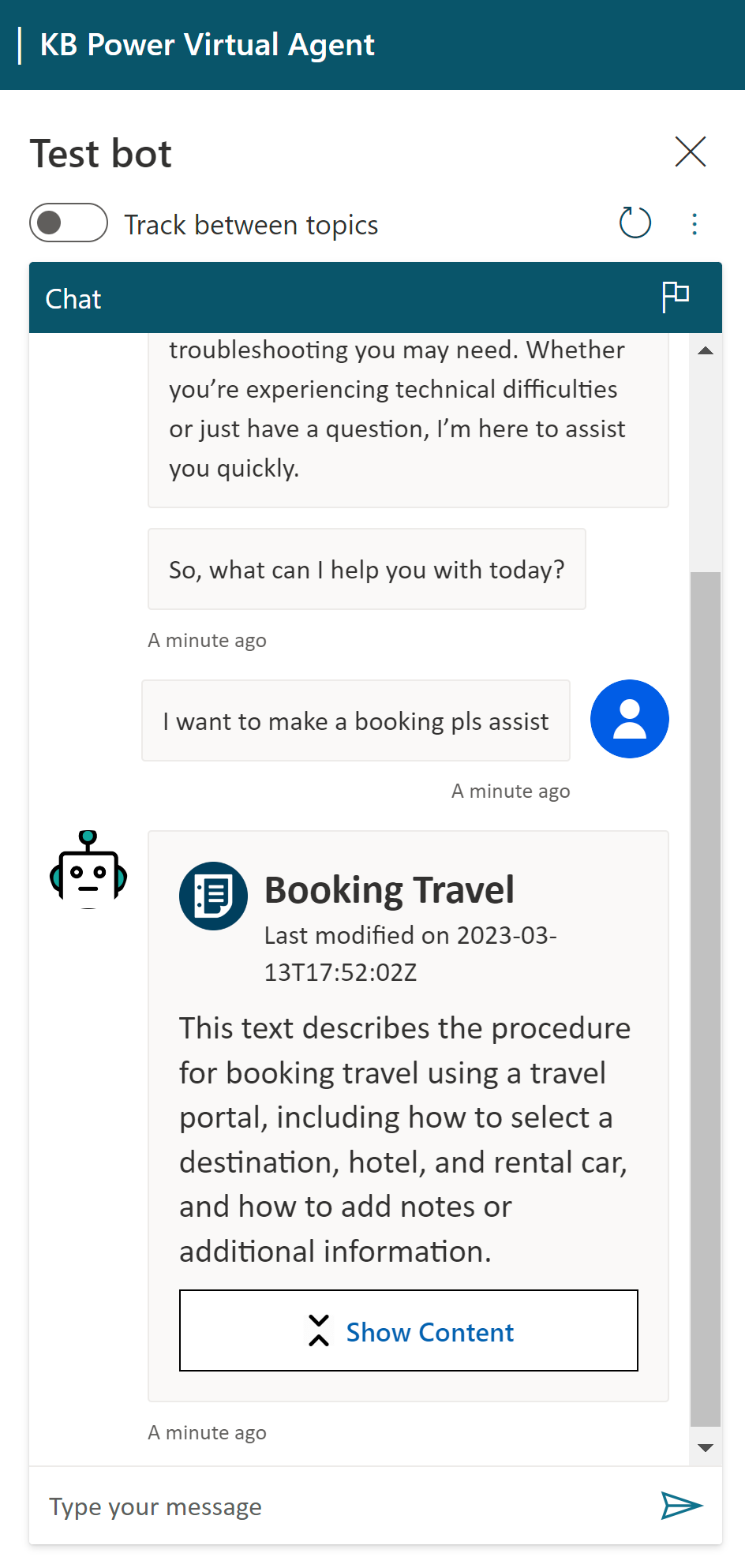 When the business user chooses the Show Content action, the chat displays a summary of the knowledge article with a link to view it in the portal.