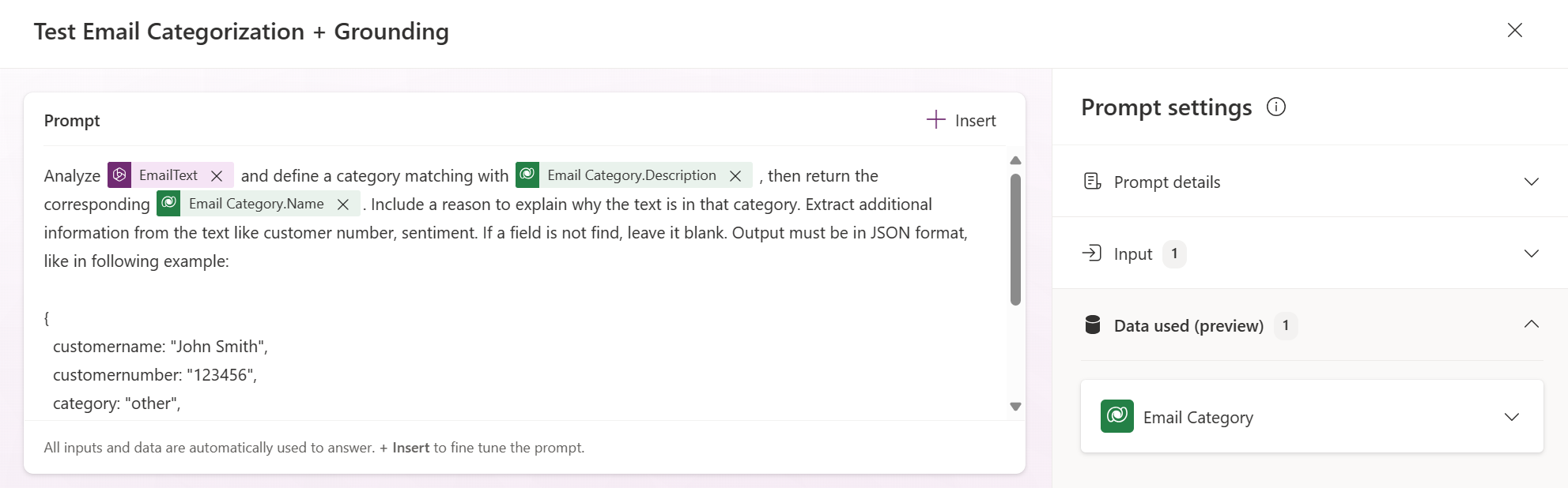 The results of this prompt will be very similar to what we obtained previously, but this time if we need to update the list of our categories, we can simply change the records in Dataverse and no change is required to the prompt definition.