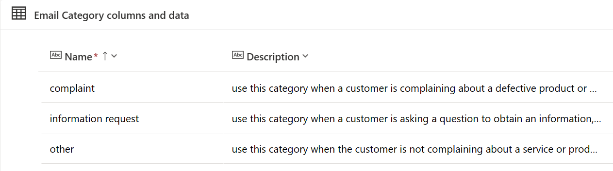 In the previous example we provided a static list of categories in the definition of our prompt. But what if we want to define and maintain the categories in a Dataverse table? Let's say for example that we created an Email Category table to list the category values and insert a description of the category: