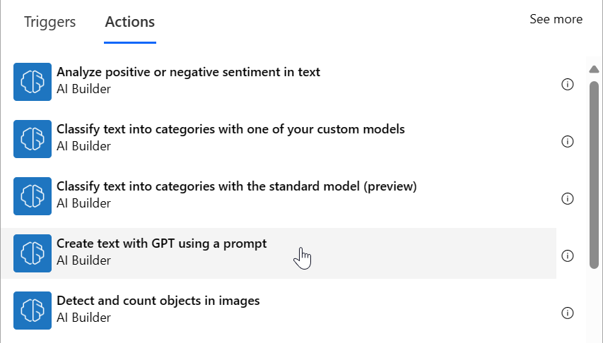 When adding the new step, start by selecting the AI Builder connector to filter available actions, and then select the action Create text with GPT using a prompt: