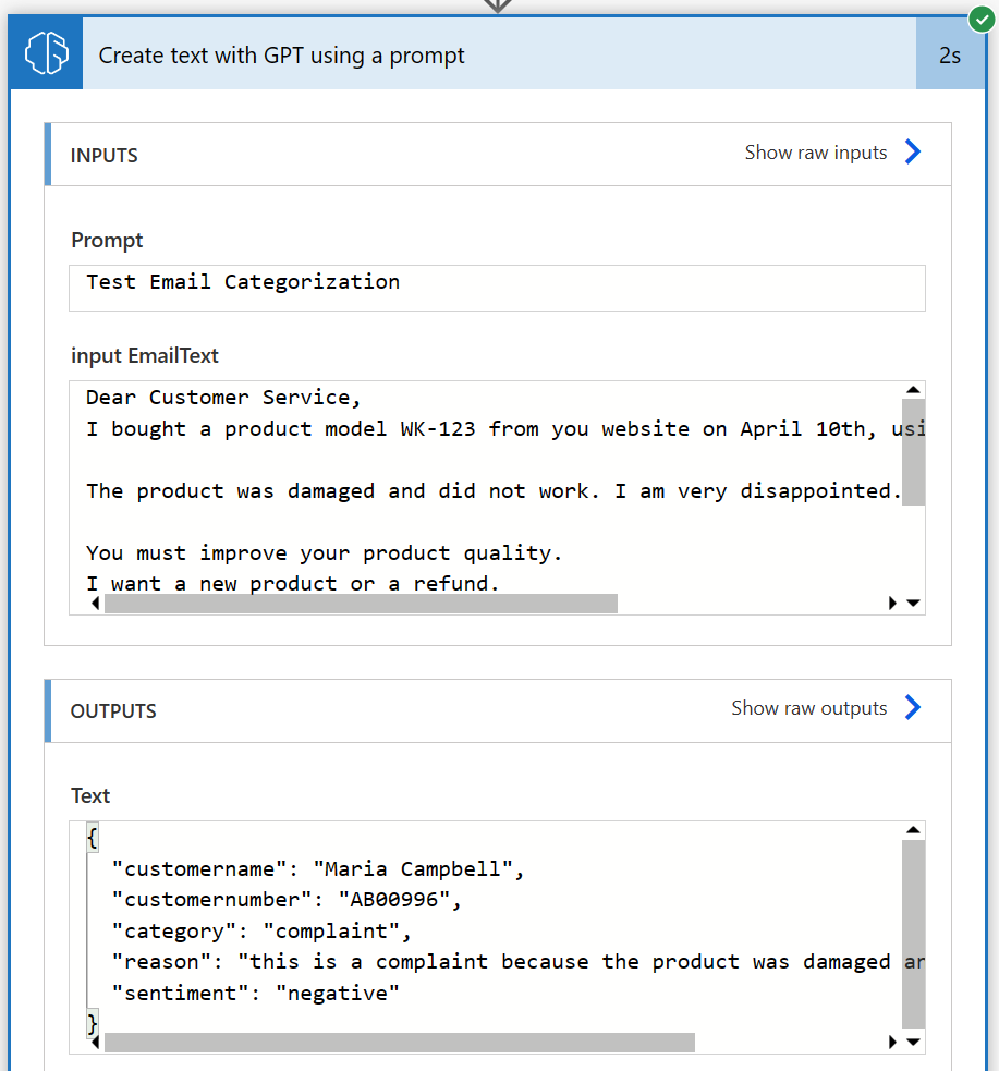 The flexibility of the GPT prompt lets you define that you want to process an input text, and you can request that the text is categorized in one of the predefined categories. You can also specify that you want a text field containing a reason to justify the assigned category. To complete the prompt, ask to extract additional information from the text. Optionally, specify if you want the output formatted as JSON and include an example of the desired data structure.
