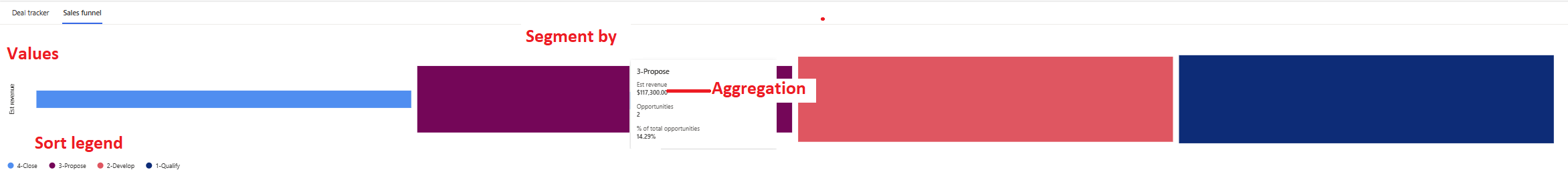 Select how to sort the chart legend. Legends indicate the color used for each segment. For example, if you select Opportunity grade as the segment, the legends will be sorted based on the chronological order of the grades. - Tooltips