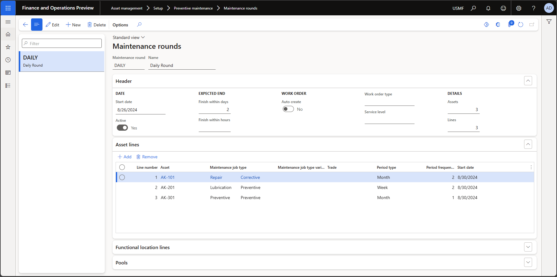 You're now able to see the maintenance rounds jobs in Asset management > Maintenance schedule > All maintenance schedule or Open maintenance schedule lines. If the scheduled rounds are connected to a work order pool, you also see maintenance schedule lines in Open maintenance schedule pools. Maintenance schedule lines created from a round have the reference type Maintenance rounds.