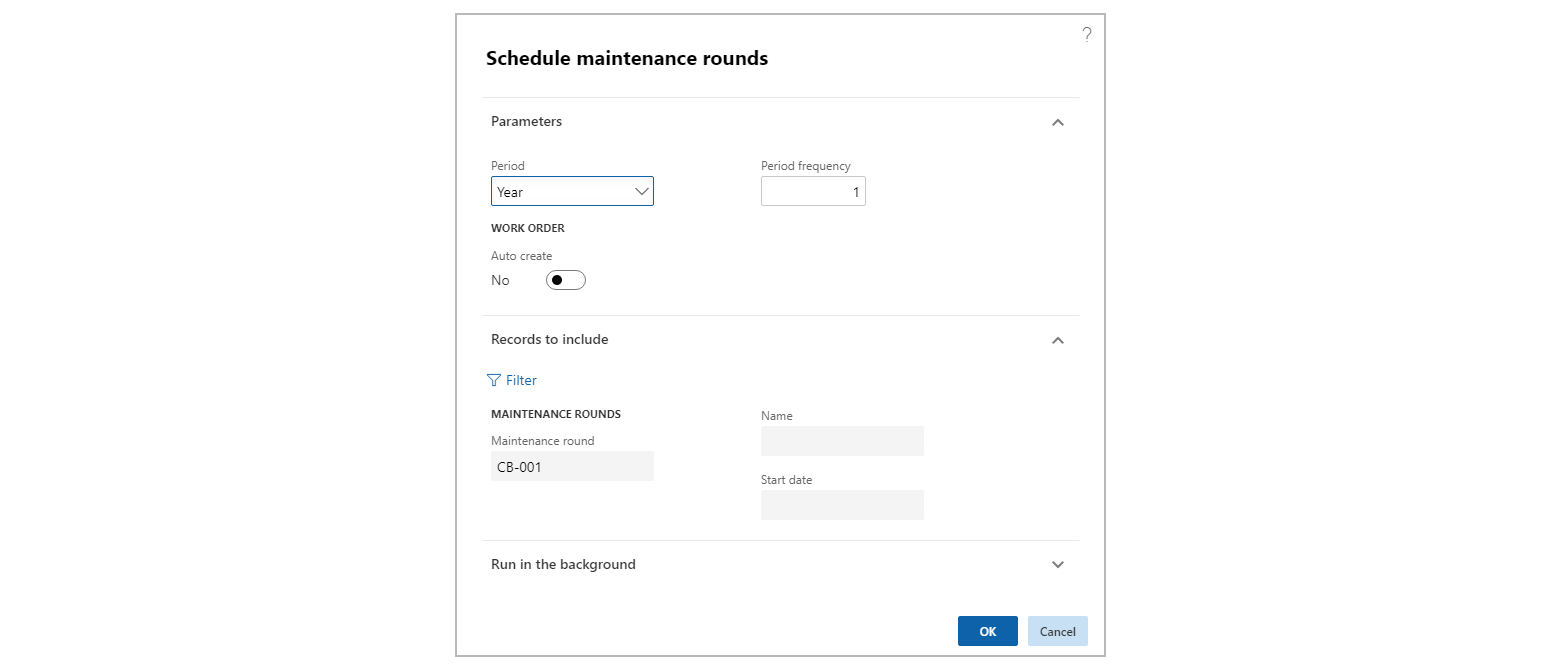 - Auto create – Set to Yes if work orders should automatically be created from maintenance schedule lines that are created from this maintenance round.