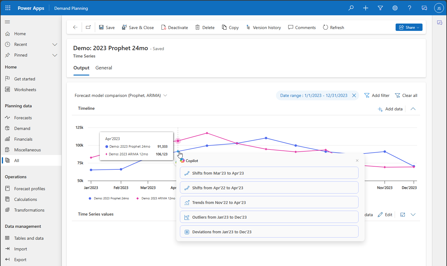 Demand planning in Microsoft Dynamics 365 Supply Chain Management lets you use Copilot to analyze your demand plans. You can select from a set of predefined questions. The app then provides answers in real time by using natural language.
