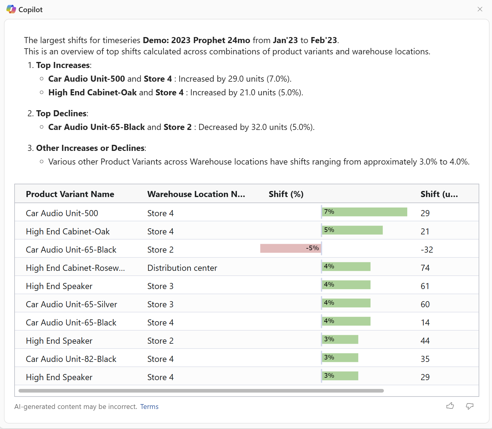For example, a demand planner is interested in learning the most significant factors that contributed to a notable shift between two consecutive periods. The planner opens the relevant worksheet, selects a point of interest on the chart, and then selects a predefined question to ask Copilot. Copilot's response might resemble the following example.