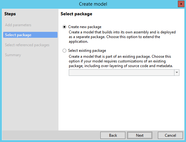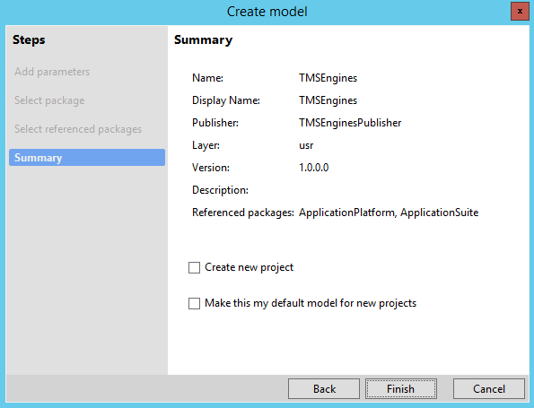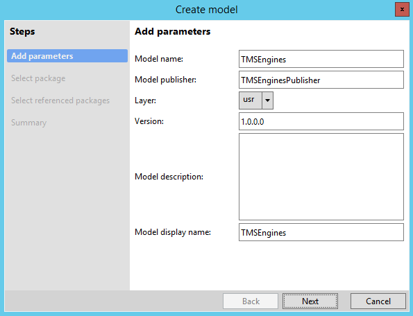 1. To deploy your new engines, you must have a model that contains the engines. On the Dynamics 365 > Model Management menu, select Create model to create a new model. On the first page of the Create model wizard, name the model TMSEngines.