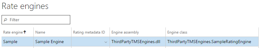 4. In Supply Chain Management, on the Rate engines page, create a new rating engine. The engine should point to the engine assembly produced by building the engine class library and the engine class that you implemented.