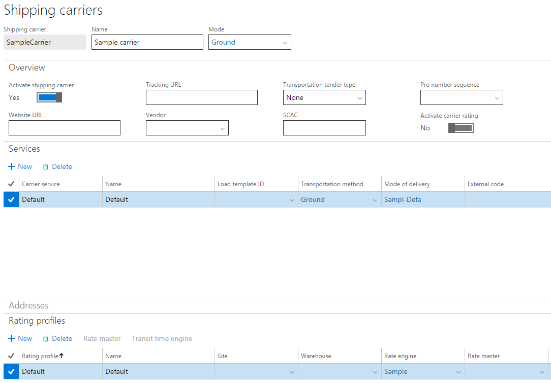 5. Create a shipping carrier that uses the Sample rate engine. Because our engine doesn't use any data, you don't have to assign a rate master.