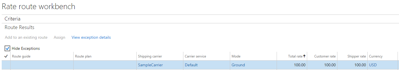 6. On the Rate route workbench page, select Rate shop. You should see a rate of 100.00 from SampleCarrier, as shown in the following screenshot. In this example, you're rate shopping for a route from warehouse 24 to customer US-004. However, but because the rate is hard-coded, you always see a rate of 100.00.