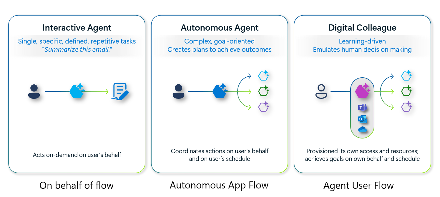 - Agents operating on their own behalf using user principals created specifically for that agent (for instance agents having their own mailbox).