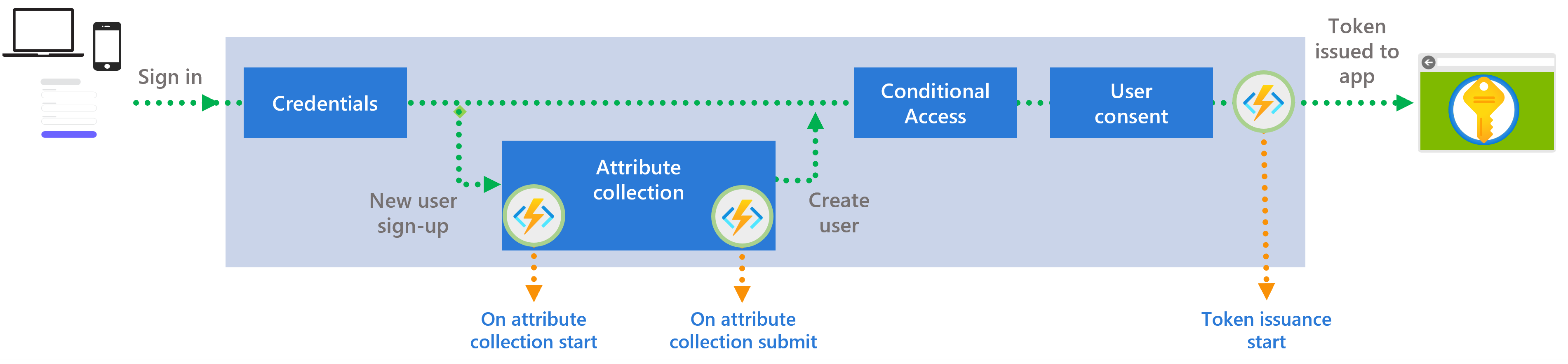 - The OnAttributeCollectionStart event occurs at the beginning of the attribute collection step, before the attribute collection page renders.