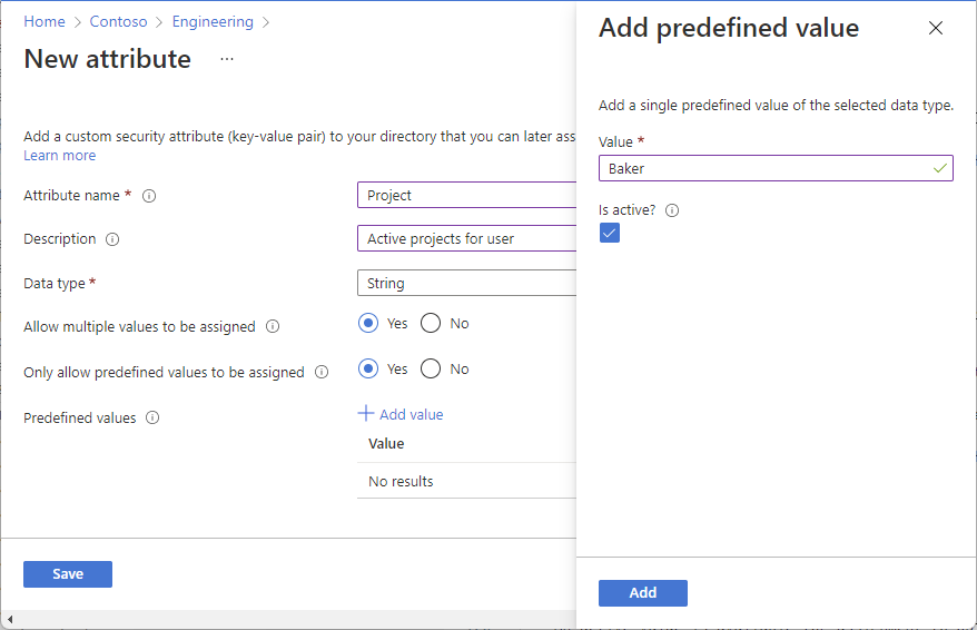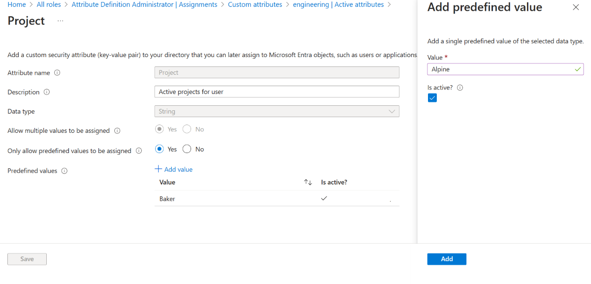 If Only allow predefined values to be assigned is Yes, select Add value to add predefined values. Select an existing predefined value to change the Is active? setting.