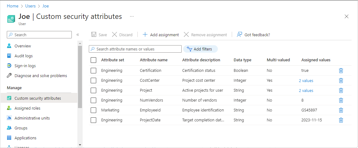 attribute assignment The assignment of a custom security attribute to a Microsoft Entra object, such as users and enterprise applications (service principals).