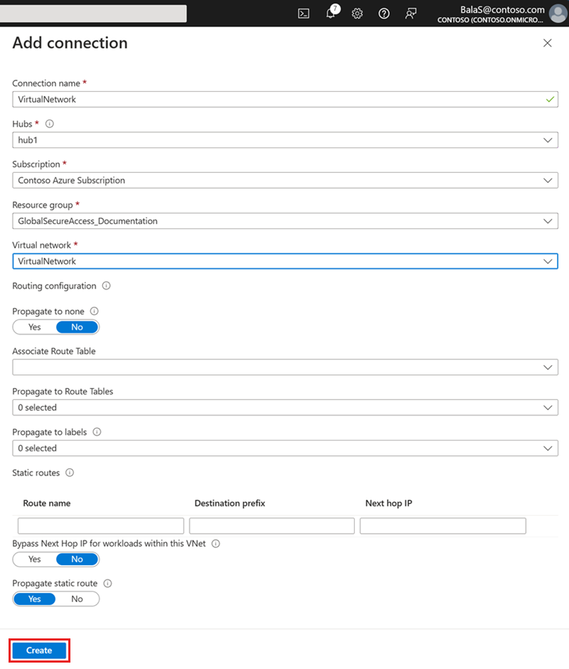- Complete the Add connection form, selecting the values from the virtual hub and virtual network created in previous sections:
