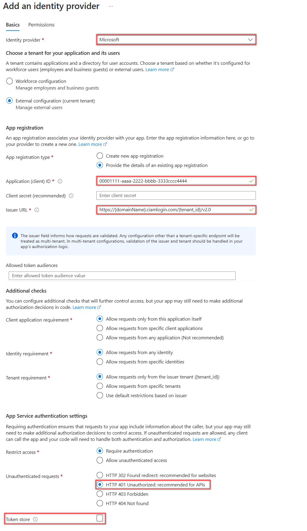 - Under Unauthenticated requests, select HTTP 401 Unauthorized as the identity provider.
