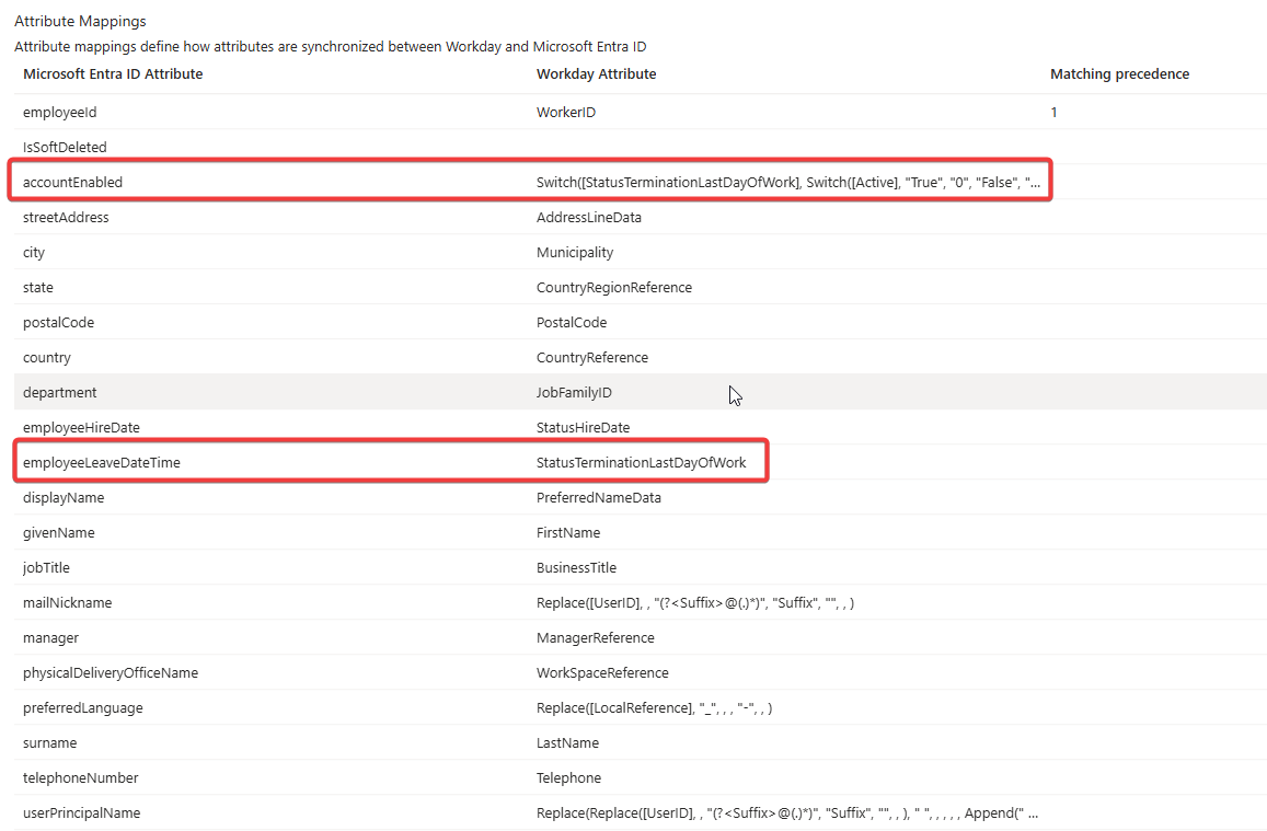 - If your Workday provisioning job target is Entra ID, then in the attribute mappings section, update the logic associated with