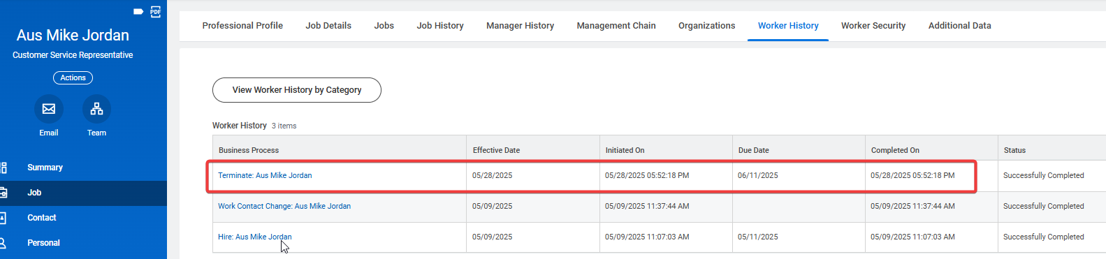 For example, in the test scenario shown above, the terminated worker is in the Melbourne time zone and his last day of work is set to May 28, 2025 Melbourne time. If this was a usual provisioning job run (without the lookahead query), the connector wouldn't see this termination event until the end of day Pacific time on May 28, 2025, which corresponds to May 29, 2025 5pm Melbourne time. However, with lookahead query, you'll now see the change show up as early as May 28, 2025 5pm Melbourne time, so the connector can disable the account based on the expression mapping logic.