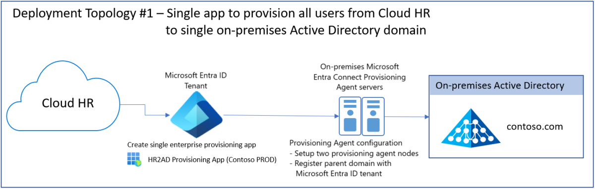 The Microsoft Entra Connect provisioning agent deployment topology depends on the number of cloud HR app tenants and Active Directory child domains that you plan to integrate. If you have multiple Active Directory domains, it depends on whether the Active Directory domains are contiguous or disjoint.