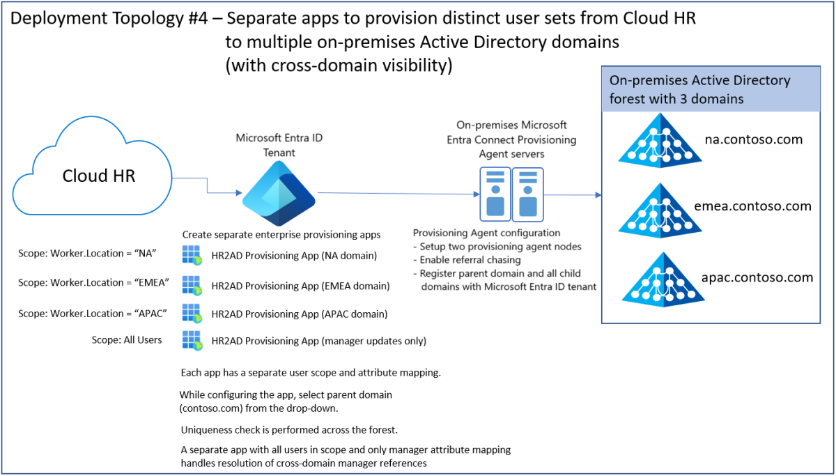- Single cloud HR app tenant -> target multiple child domains in a disjoint Active Directory forest
