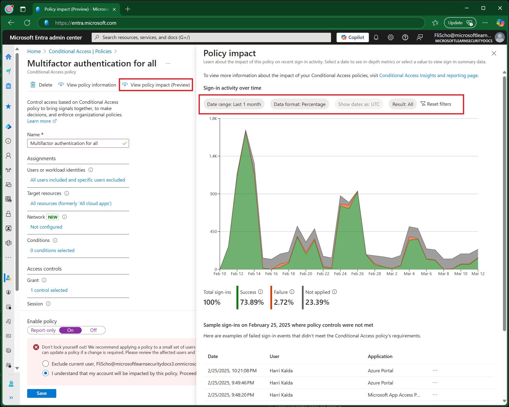 The policy impact view of Conditional Access lets admins with at least the Security Reader role see a snapshot of the potential or existing impacts of policies on interactive sign-ins in your organization. You can explore the impact over the past 24 hours, 7 days, or 1 month. You can also see and link to a sampling of sign-in events for more details.