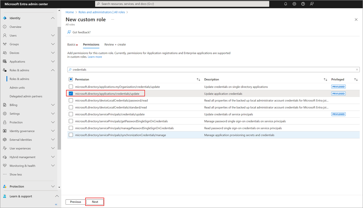 1. First, enter "credentials" in the search bar and select the microsoft.directory/applications/credentials/update permission.