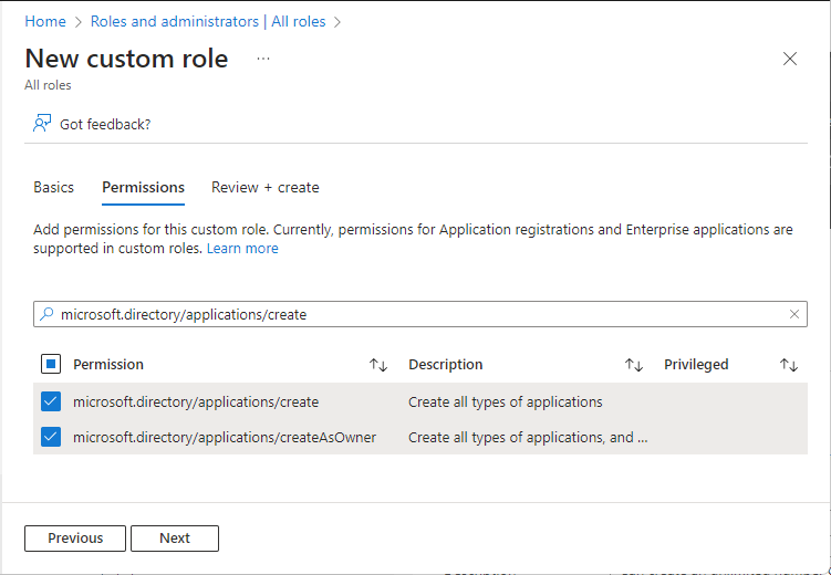 On the Permissions tab, enter "microsoft.directory/applications/create" in the search box, and then select the checkboxes next to the desired permissions, and then select Next.