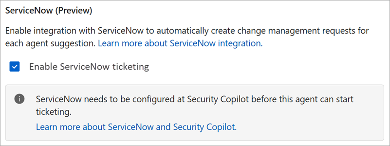 Organizations that use the ServiceNow plugin for Security Copilot can now have the Conditional Access optimization agent create ServiceNow change requests for each new suggestion the agent generates. This allows IT and security teams to track, review, and approve or reject agent suggestions within existing ServiceNow workflows. At this time, only change requests (CHG) are supported.