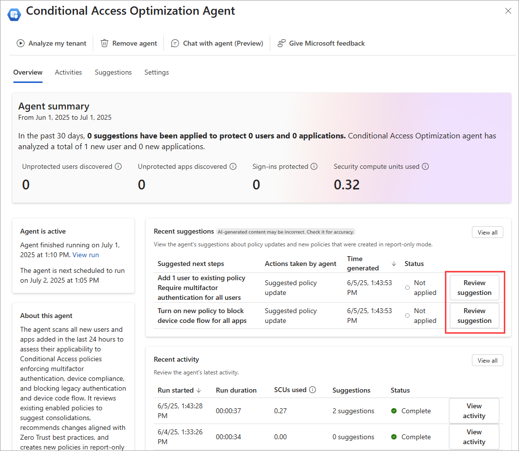 When the agent overview page loads, any suggestions appear in the Recent suggestions box. If a suggestion was identified, you can review the policy, determine policy impact, and apply the changes if needed. For more information, see Review and approve Conditional Access agent suggestions.