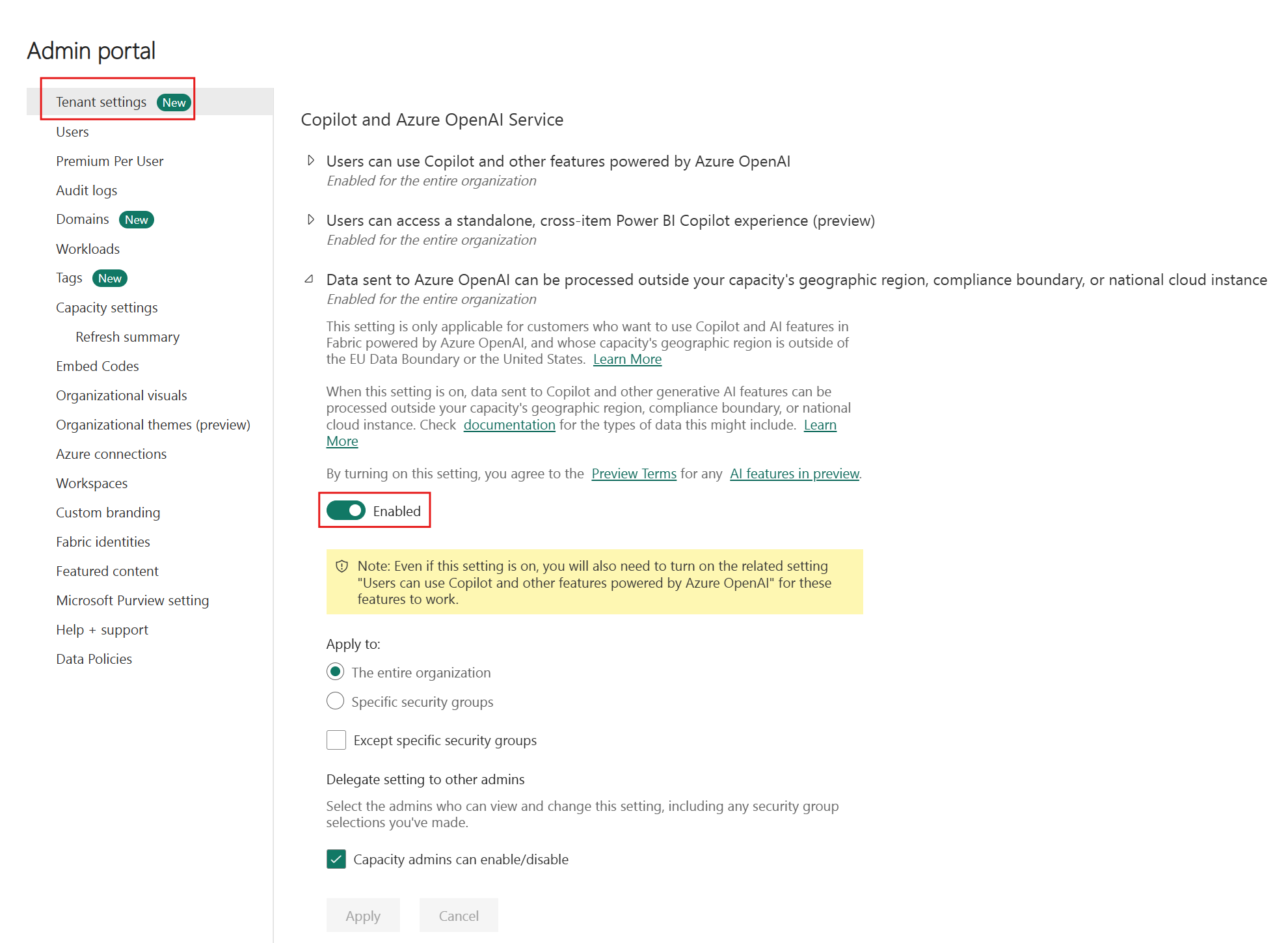 You can enable copilot as a standalone experience for Fabric. Enabling this setting allows users to access the standalone Copilot experience from the left navigation. The Azure OpenAI setting must be enabled at the tenant level to use the standalone experience. This setting also affects the Power BI agent. Turn on this setting to enable the Power BI agent in Microsoft 365. To learn more, see standalone Copilot experience.