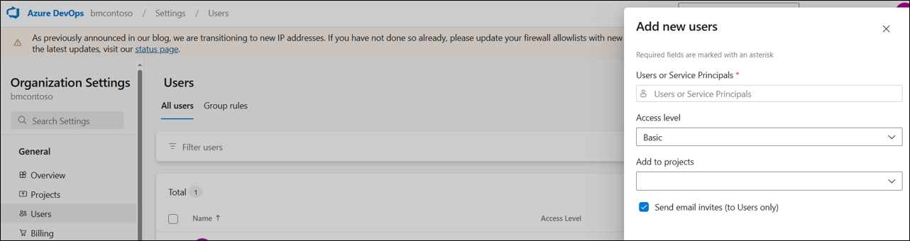 After creating our application and the service principal, we need to add it to our Azure DevOps organization to grant access to resources.