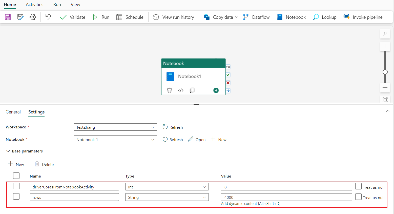 If you want to change the session configuration, pipeline notebook activity parameters name should be same as parameterName in the notebook. In this example of running a pipeline, driverCores in %%configure are replaced by 8, and livy.rsc.sql.num-rows are replaced by 4000.