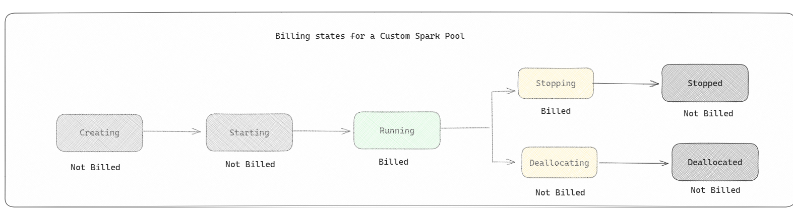 - Spark pools are billed like starter pools; you don't pay for the custom Spark pools that you have created unless you have an active Spark session created for running a notebook or Spark job definition. You're only billed for the duration of your job runs. You aren't billed for stages like the cluster creation and deallocation after the job is complete.