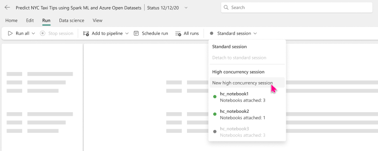 Create a new notebook and by navigating to the Run menu as mentioned in the above steps, in the drop-down menu you will now see the newly created high concurrency session listed.