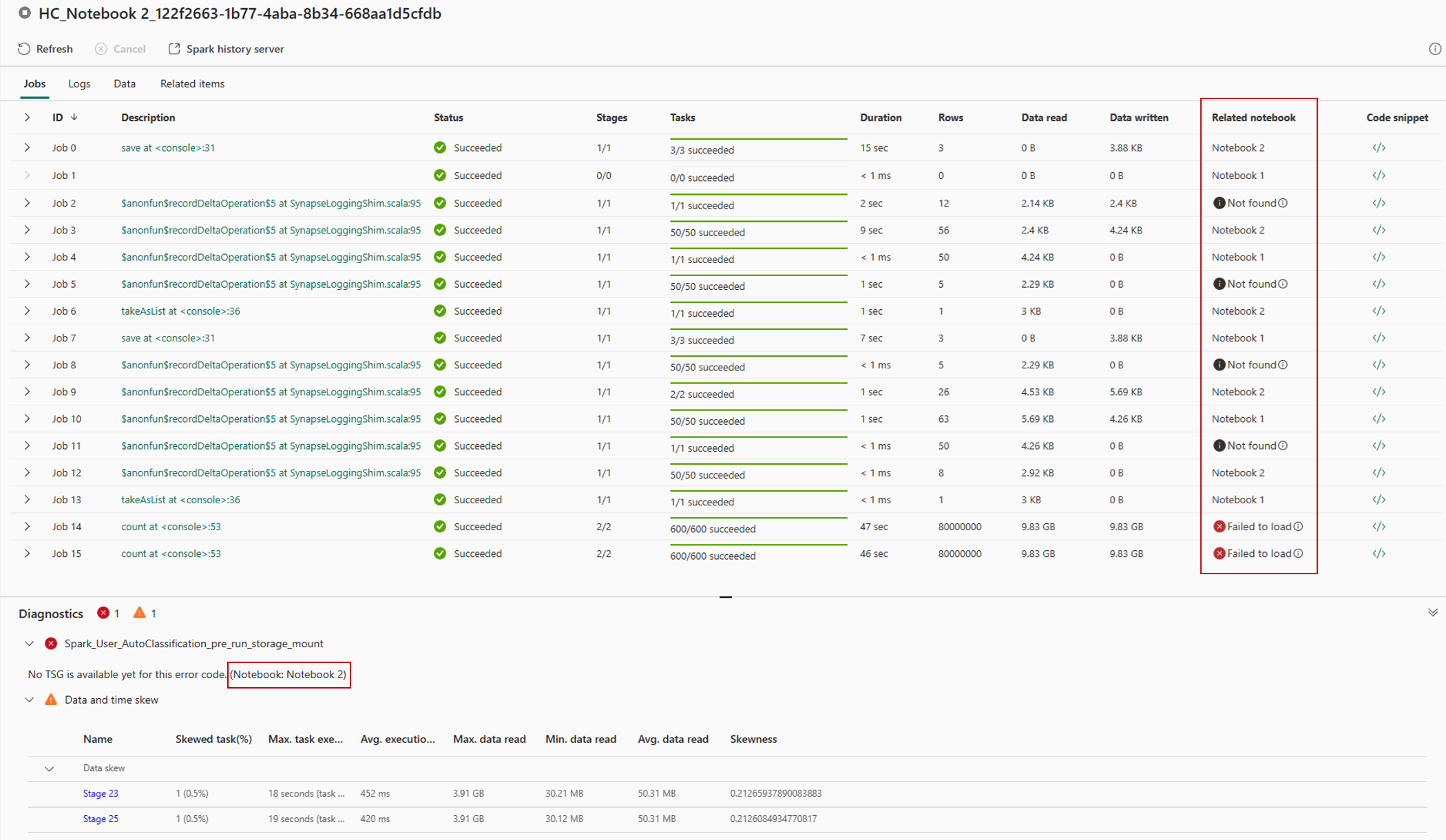 In the case of high concurrency session, users could identify the jobs and its associated logs from different notebooks using the Related notebook tab, which shows the notebook from which that job has been run.