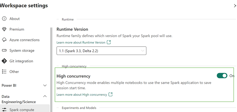 By default, all the Fabric workspaces are enabled with high concurrency mode. Use the following steps to configure the high concurrency feature:
