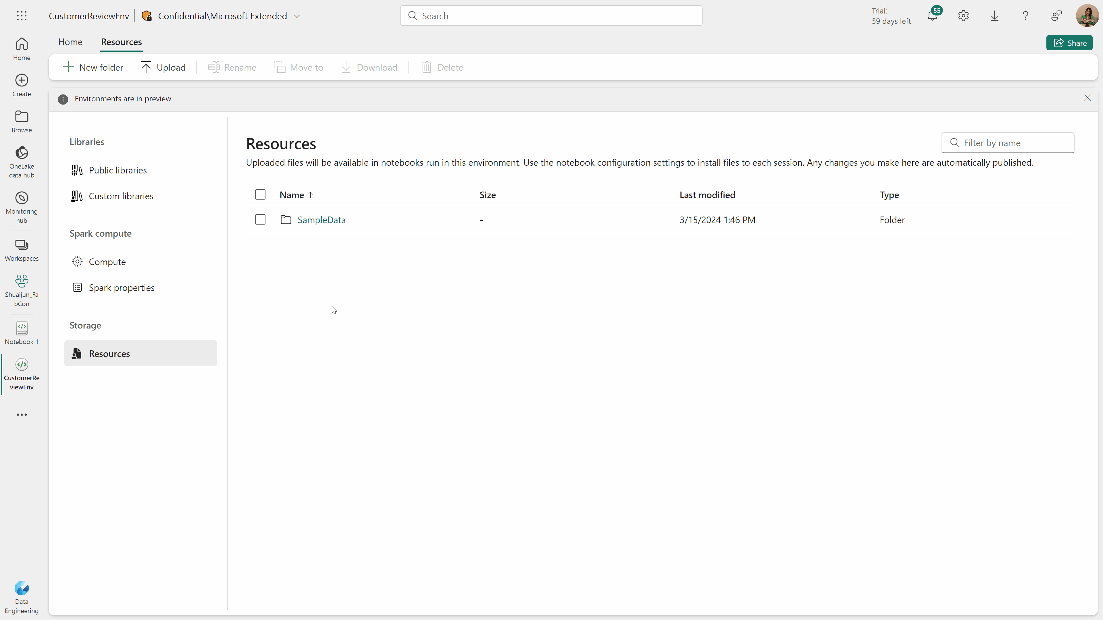 When the notebook is attached to an environment, you can easily find the environment Resources folders that appear in Explorer. You can do common operations like uploading, downloading, renaming, deleting, and moving files. You can also create, delete, and rename folders from both the environment and the notebook UI.